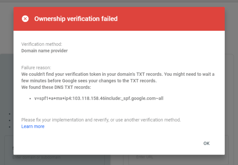 Step5: After clicking on Verify, we still got some error and google search console showed “Ownership verification failed”.